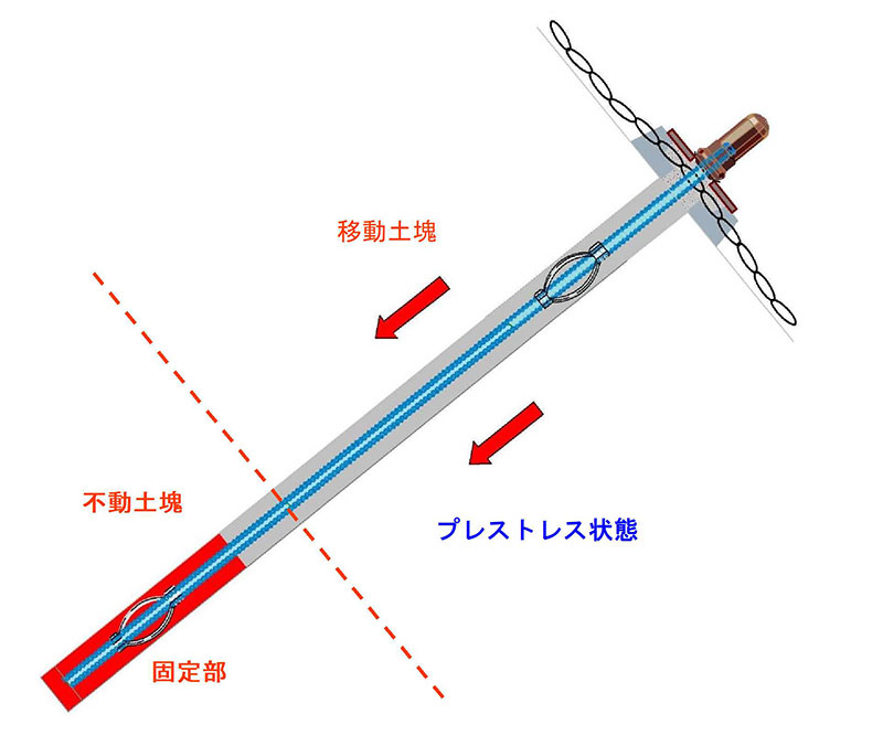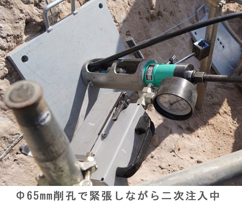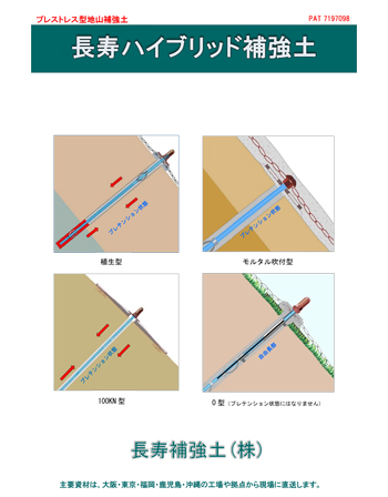 長寿ハイブリッド補強土は、地山の深部から補強材を引張り、法面工を抑えつける事が出来る補強土工です。