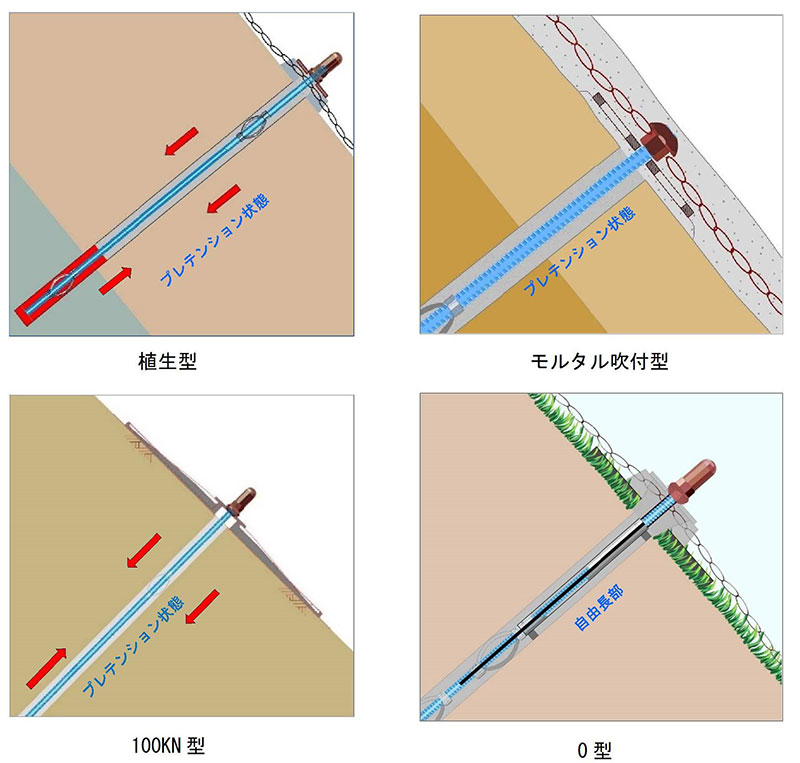 補強材を緊張するため、移動土塊を内部から緊張できます。固定部造成のための一次注入と残りの区間にグラウトする二次注入が有ります。詳細は設計・施工・積算要領をご覧ください。植生型とモルタル吹付型の2タイプがから選定出来ます。