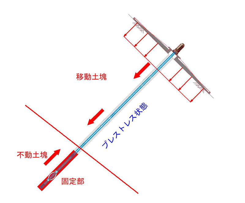 小規模なアンカーとして利用できます。受圧板には設計荷重が作用します(従来の一般的な補強土では受圧板に設計荷重は作用しません)。アンカー工と同じく移動土塊を抑えつけることが出来ます。それだけでは無く、地盤内部からも移動土塊を拘束します(この効果は従来のアンカーにも有りません)。受圧板を設置する地盤が軟質でも、受圧板が沈下することはほとんど有りません。グラウト材で移動土塊の内部で補強材が地盤と一体化しているためです。補強材の長さは7mまでは可能です。D25のネジ節棒鋼を利用すると、100KNの荷重を架けることが出来ます。