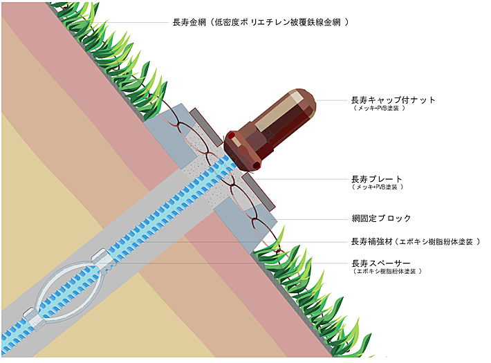 長寿命補強土 植生型 は、切土法面に適用する超耐久性の補強土工です。設計計算法は、既に確立された一般的な手法(NEXCO要領など)を用います。 従来工法と同等~低コストです。