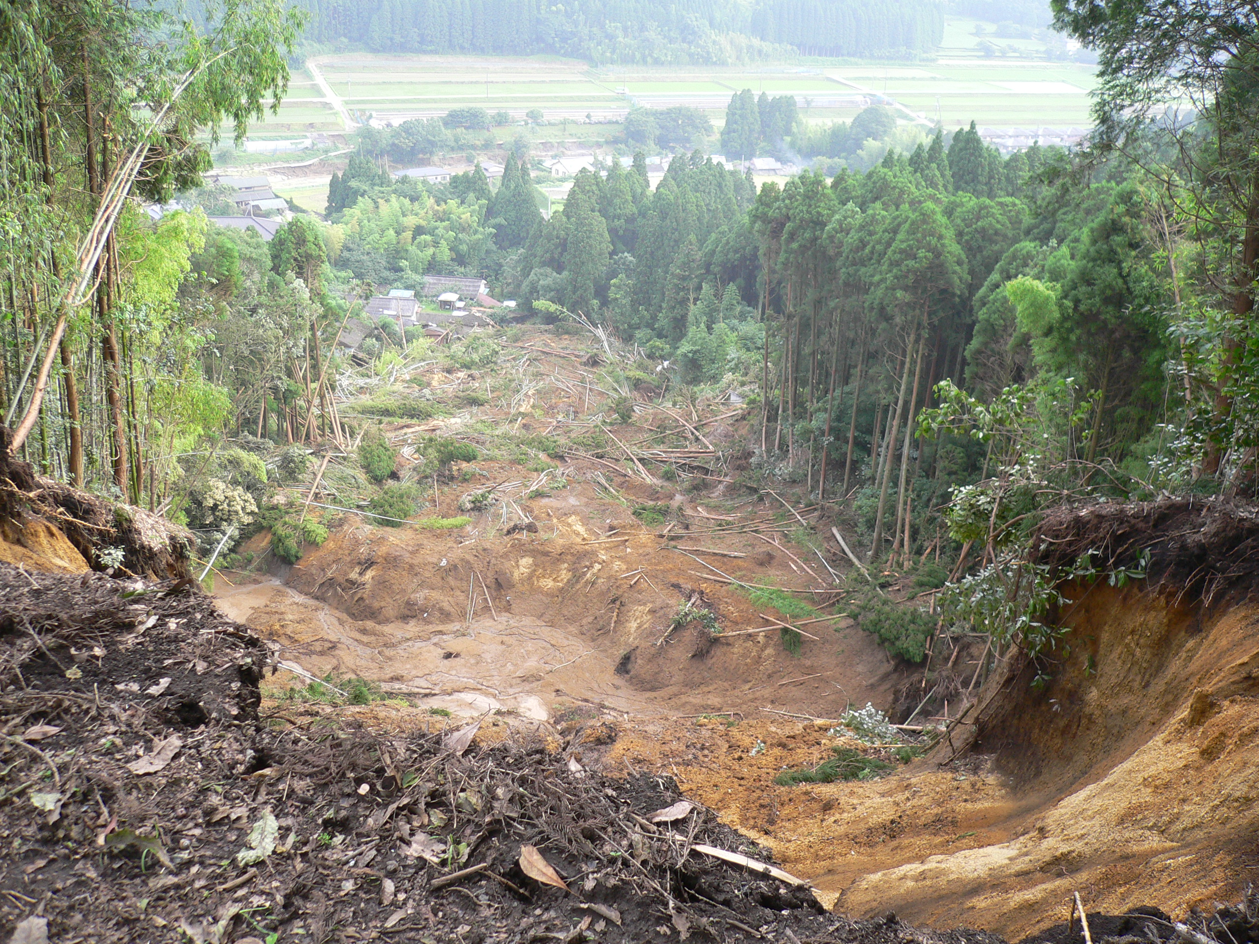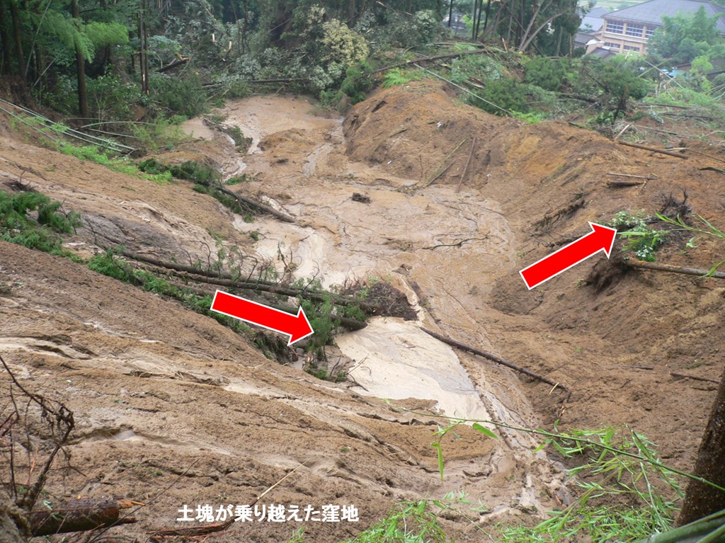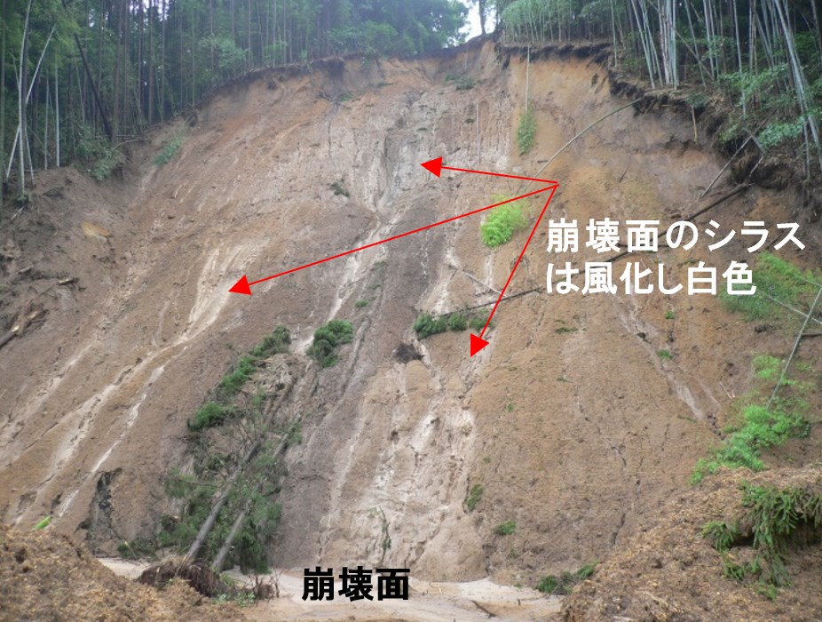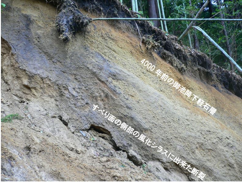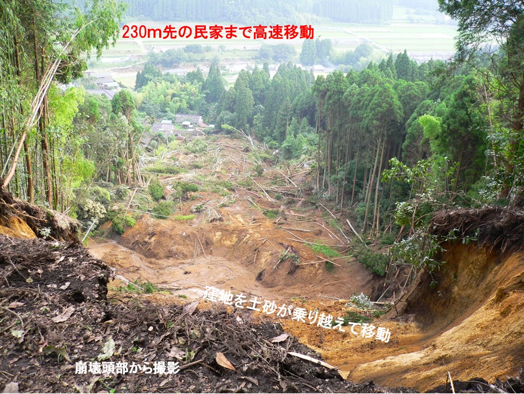 ⾼さ約40mのシラス斜⾯が崩壊し、230mも先の 家を襲いました。通常、崩⼟は、斜⾯の下部に堆積します。しかし、この現場では、下部に高さ5mの堤と幅15mの窪地がありますが、この窪地を飛び越えて土塊が移動しています。とんでもない高速移動です。上部に4000 年前の降下軽石が堆積しているので、4000 年ものあいだ、斜面更新されずに、シラスは極めて風化し多量の白色粘土(10 オングストロームハロイサイト)が形成されていました。しかも、高含水比で、シラスなのに斜面を歩くとズルズルと滑ります。風化シラスの表層に分布する鋭敏比が高い白色粘土が、崩壊時にすべり面液状化を起こしたと考えています。そのために、極めて高速の移動をしたと想像されます。さらに、梅雨時期のため、窪地や下流の緩斜にも表層には水があったので、高速で長距離を土塊が走ったのでしょう。予知が難しく、逃げることも出来ない危険な地すべり(崩壊)です。