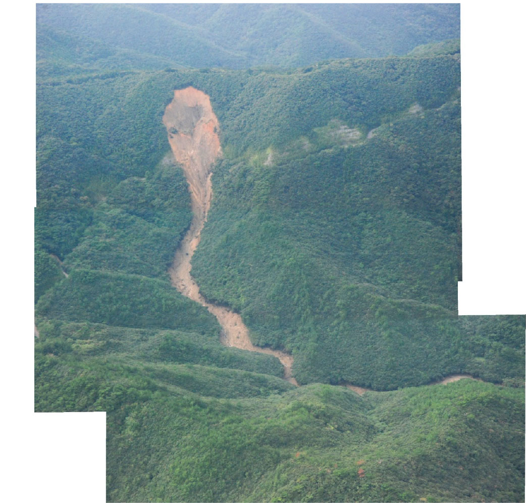 図-1 崩壊地の全景 ⼟⽯流として約 600m流れ下る