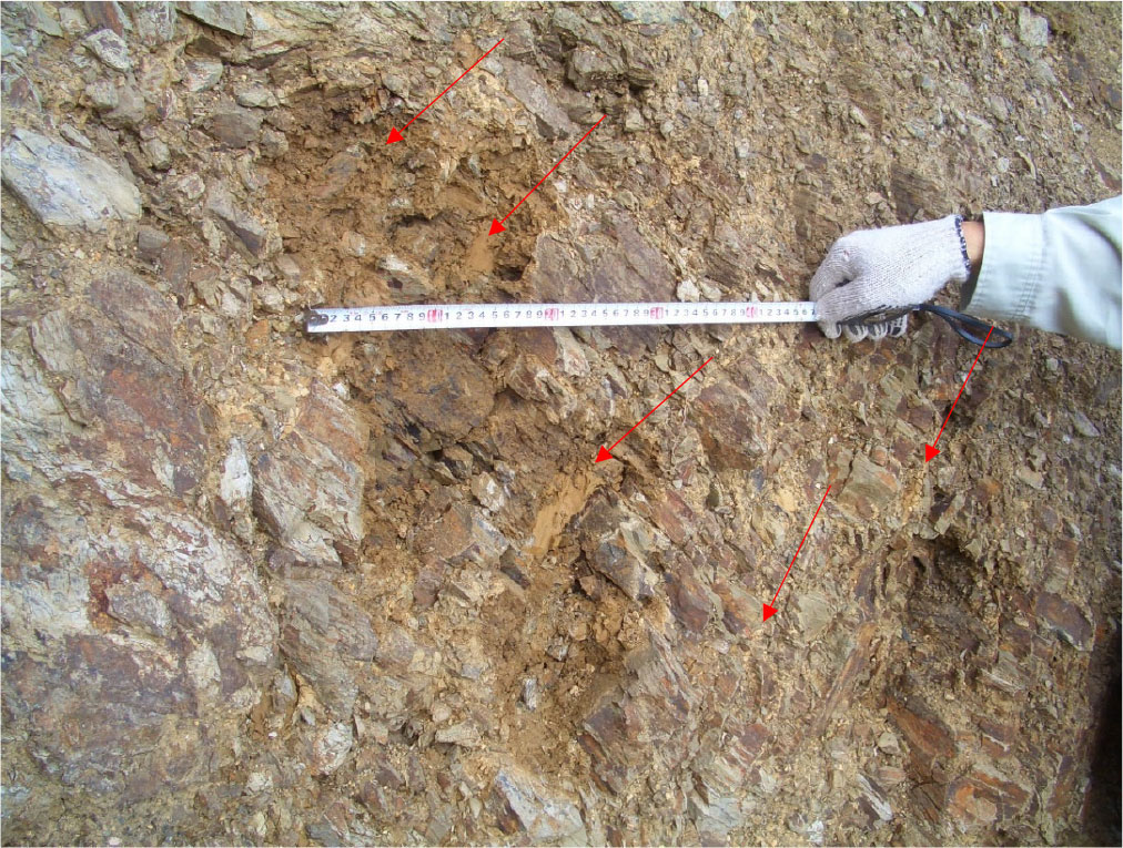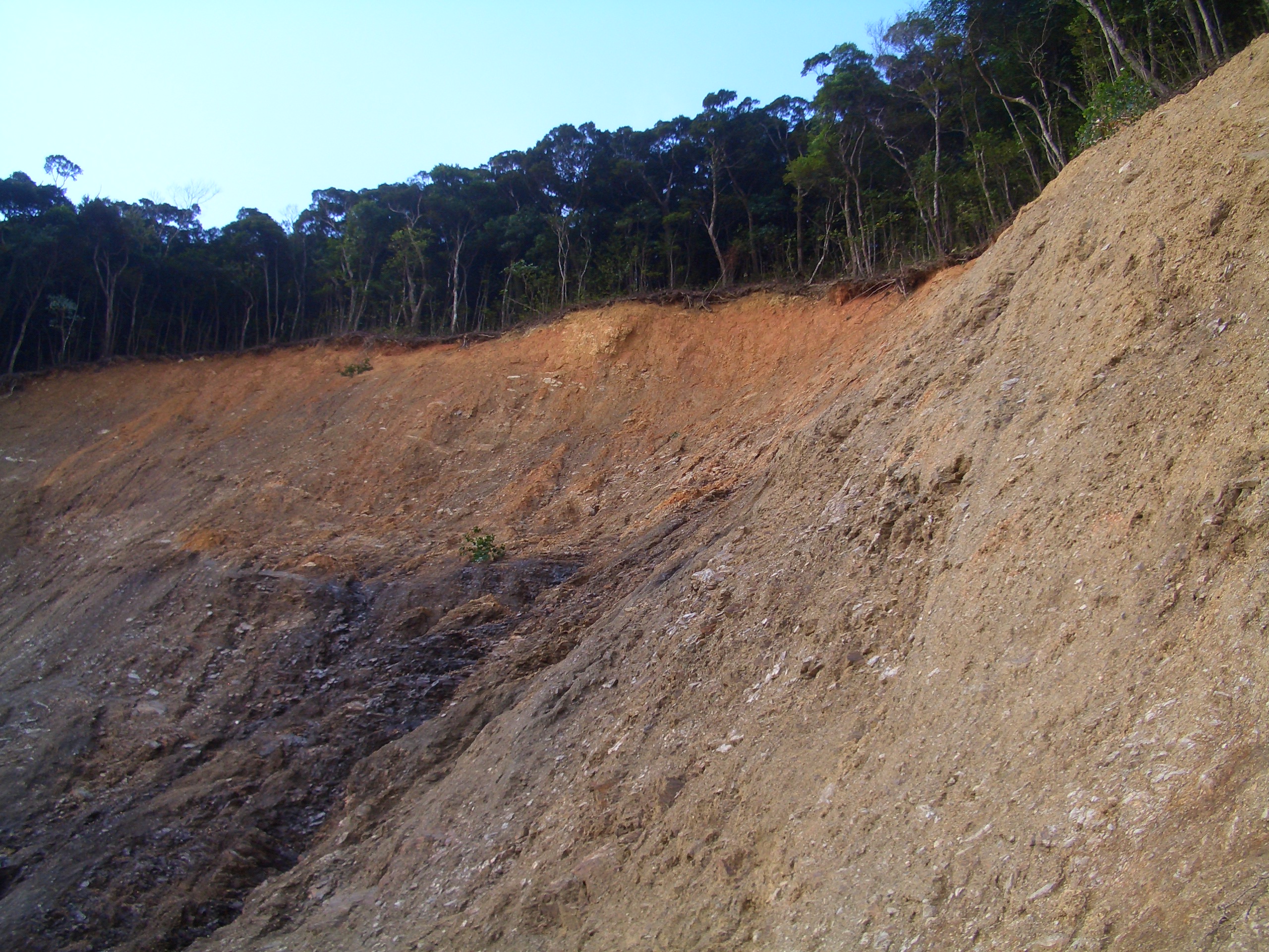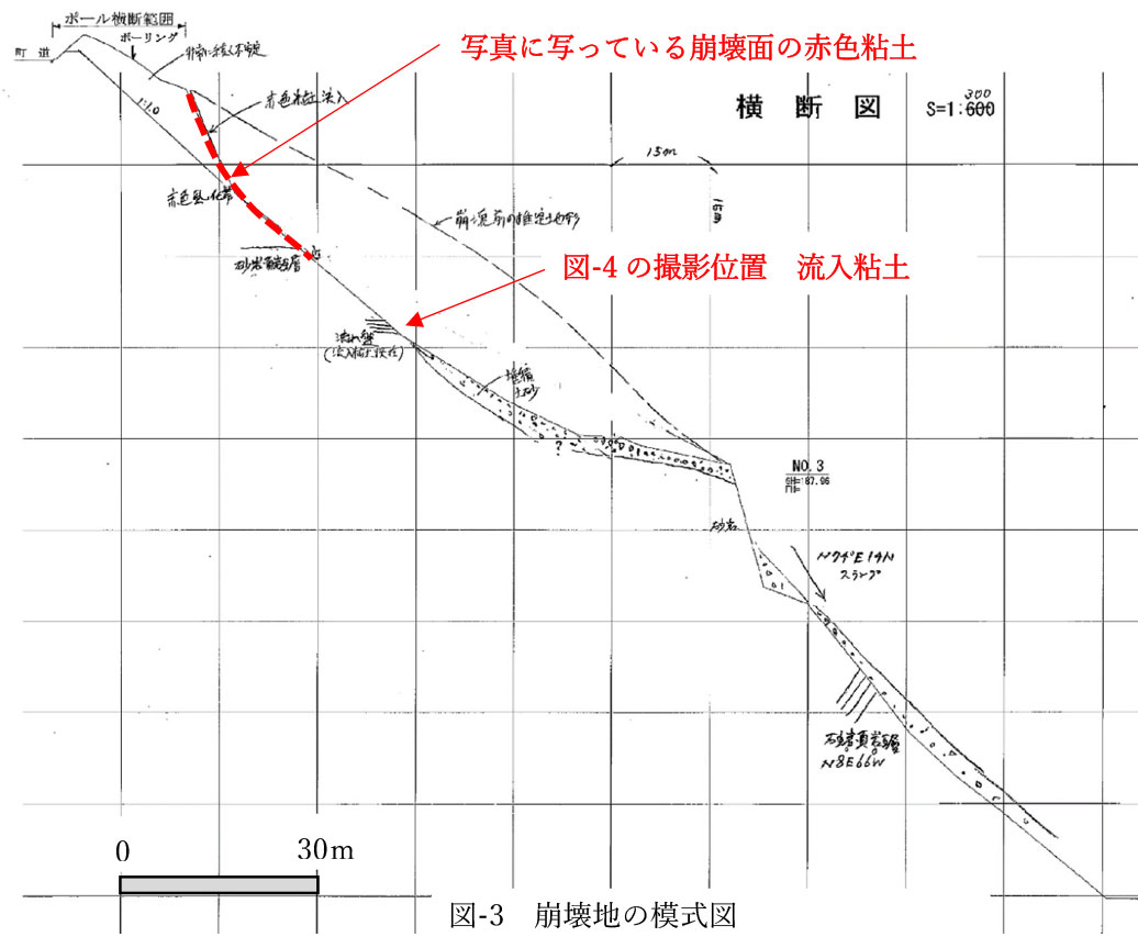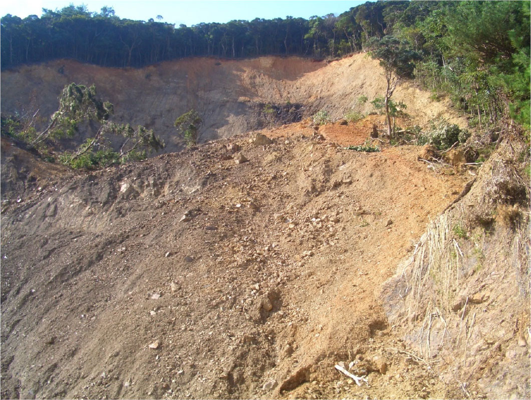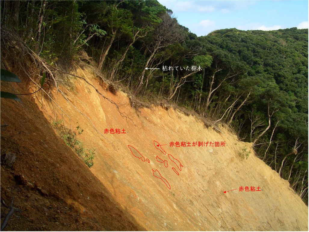 崩壊発⽣の予知は難しい現状ですが、この崩壊では、崩壊面(すべり面)に沿って、スプーン状の一枚の粘⼟シートが形成されていたようです。写真では、崩壊後に所々赤色粘⼟が剥げた箇所が見られます。赤色粘⼟は、崩壊前に出来た断裂に地表付近の赤色粘⼟が流入したものと考えられます。